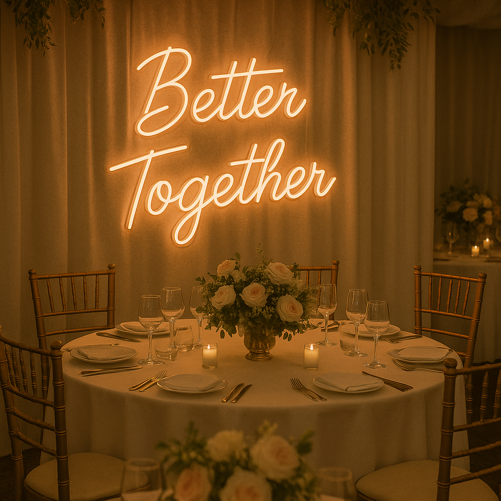 Depuis quelques années, le néon LED s’impose comme l’accessoire déco tendance qui transforme l’ambiance d’un événement. Loin des enseignes en verre fragiles et énergivores des années 80, le néon LED réinvente la lumière en version chic, design et personnalisée. Les couples cherchent aujourd’hui à créer des mariages uniques, immersifs et photogéniques. Et quoi de plus marquant qu’une phrase lumineuse “Better Together”, un prénom ou une date qui scintille en toile de fond ?