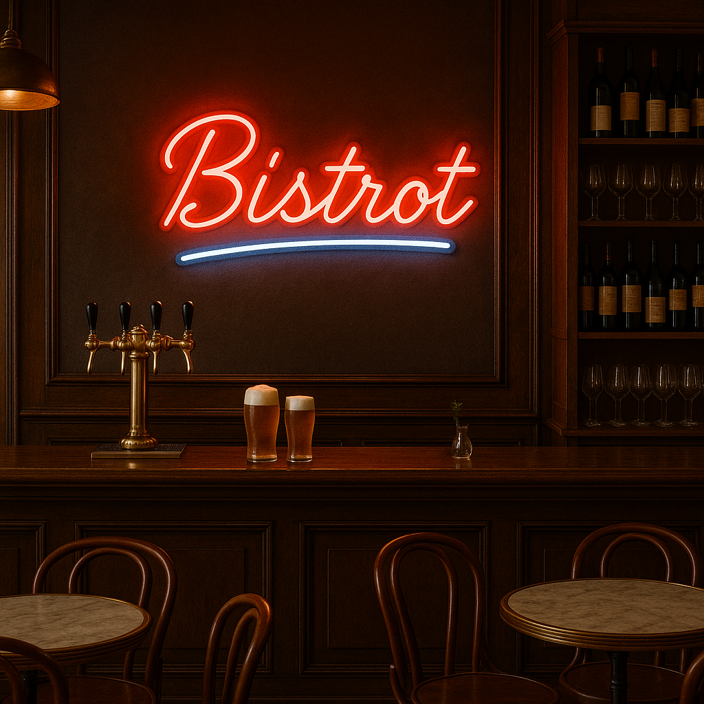 Plongez vos clients dans une ambiance chaleureuse et authentique grâce au néon LED Bistrot signé Neonvia. Véritable enseigne lumineuse au style rétro-chic, il apporte immédiatement une touche conviviale à votre établissement ou à votre intérieur. Que vous soyez propriétaire d’un café, d’un bar ou passionné de décoration murale, ce luminaire LED au design raffiné saura créer une atmosphère unique, élégante et accueillante.