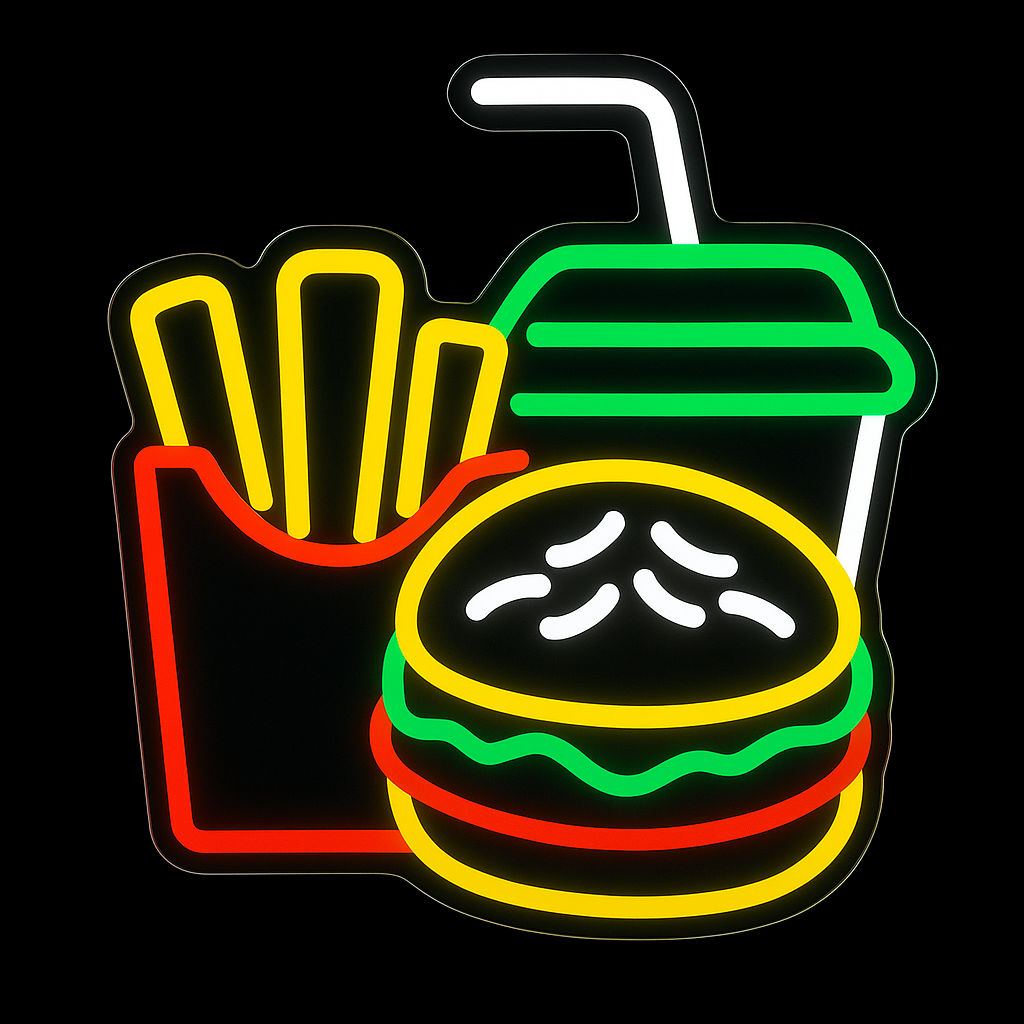 Chez Neonvia, chaque néon Burger est conçu avec des matériaux haut de gamme. La technologie LED garantit une consommation réduite, une longue durée de vie et une lumière propre, éclatante et parfaitement maîtrisée. Le panneau lumineux est monté sur un support transparent discret, mettant en valeur chaque trait lumineux.