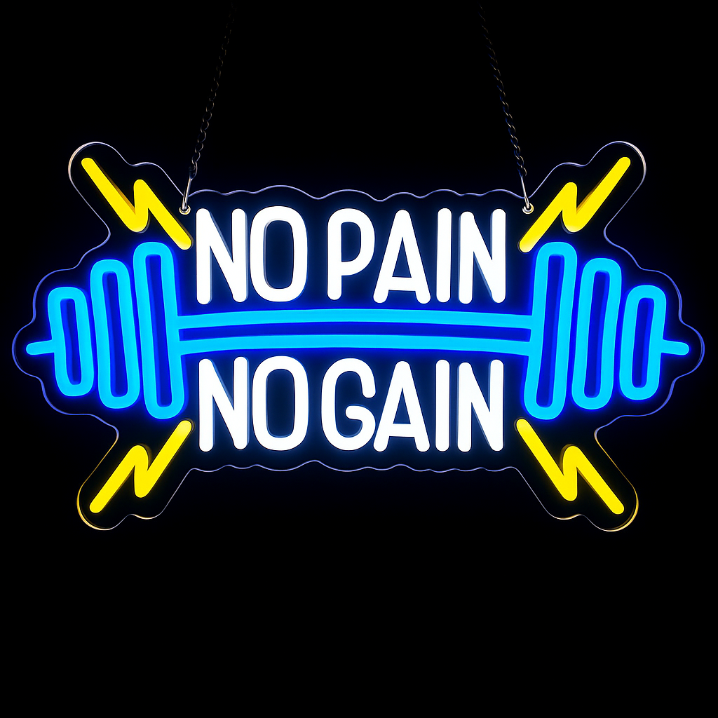 Le néon No Pain No Gain est le cadeau idéal pour les sportifs, coachs ou entrepreneurs qui aiment se dépasser. Parfait pour personnaliser une salle d’entraînement, un home gym ou un espace de travail, il apporte une touche design et motivante à votre décor.